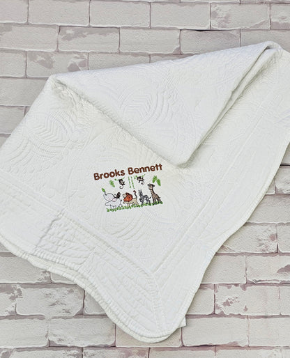 Cotton quilted heirloom baby blanket embroidered with your choice of design name and birth stats all or any of the above